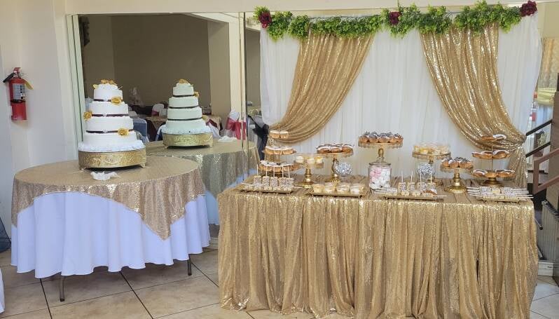 Manteleria completa Manteles con diamante, forros con moño, manteles largos para mesa principal, 4- pilares de globos y un arco de globos, una cortina con luces por $ 980, reserve hoy y ahorre